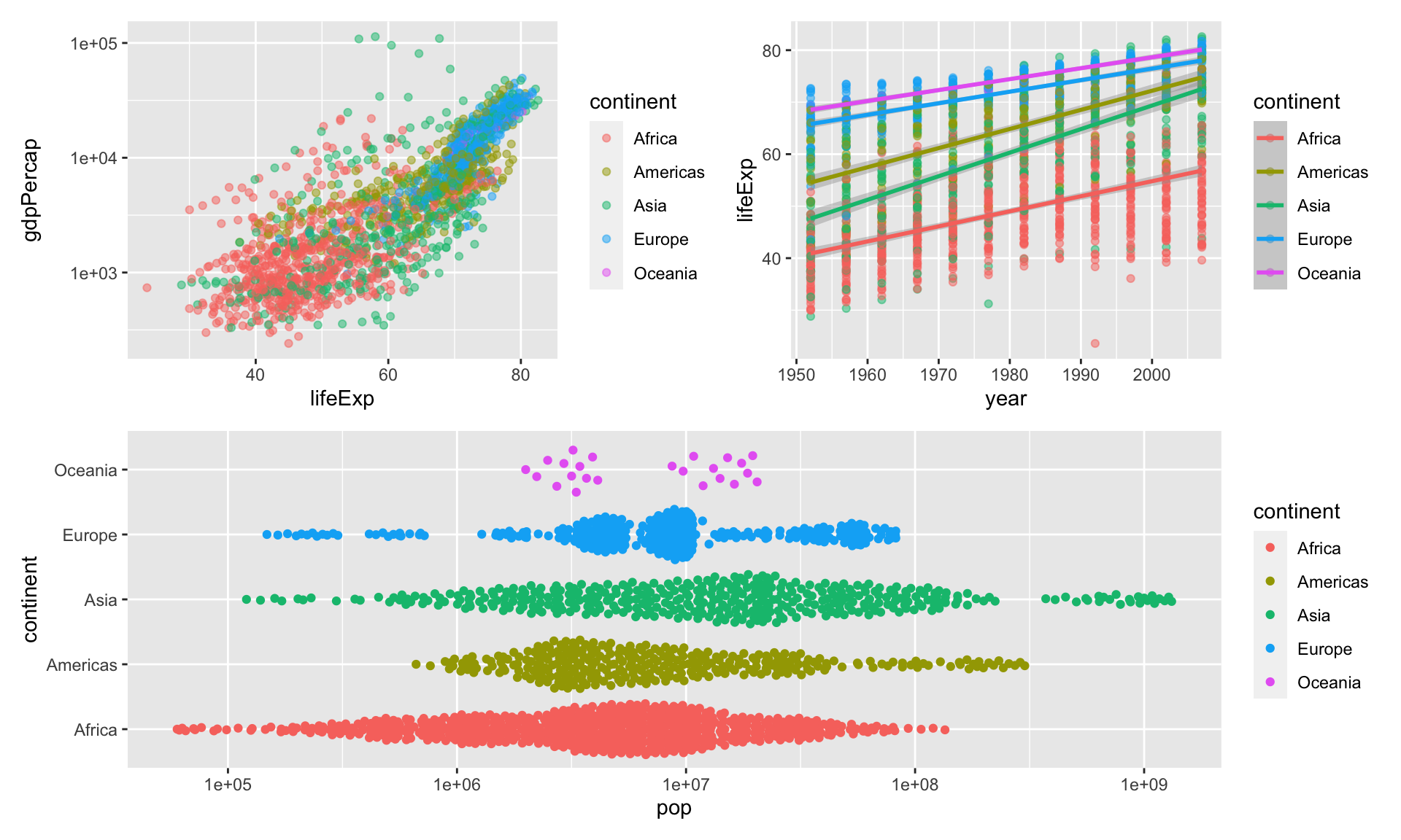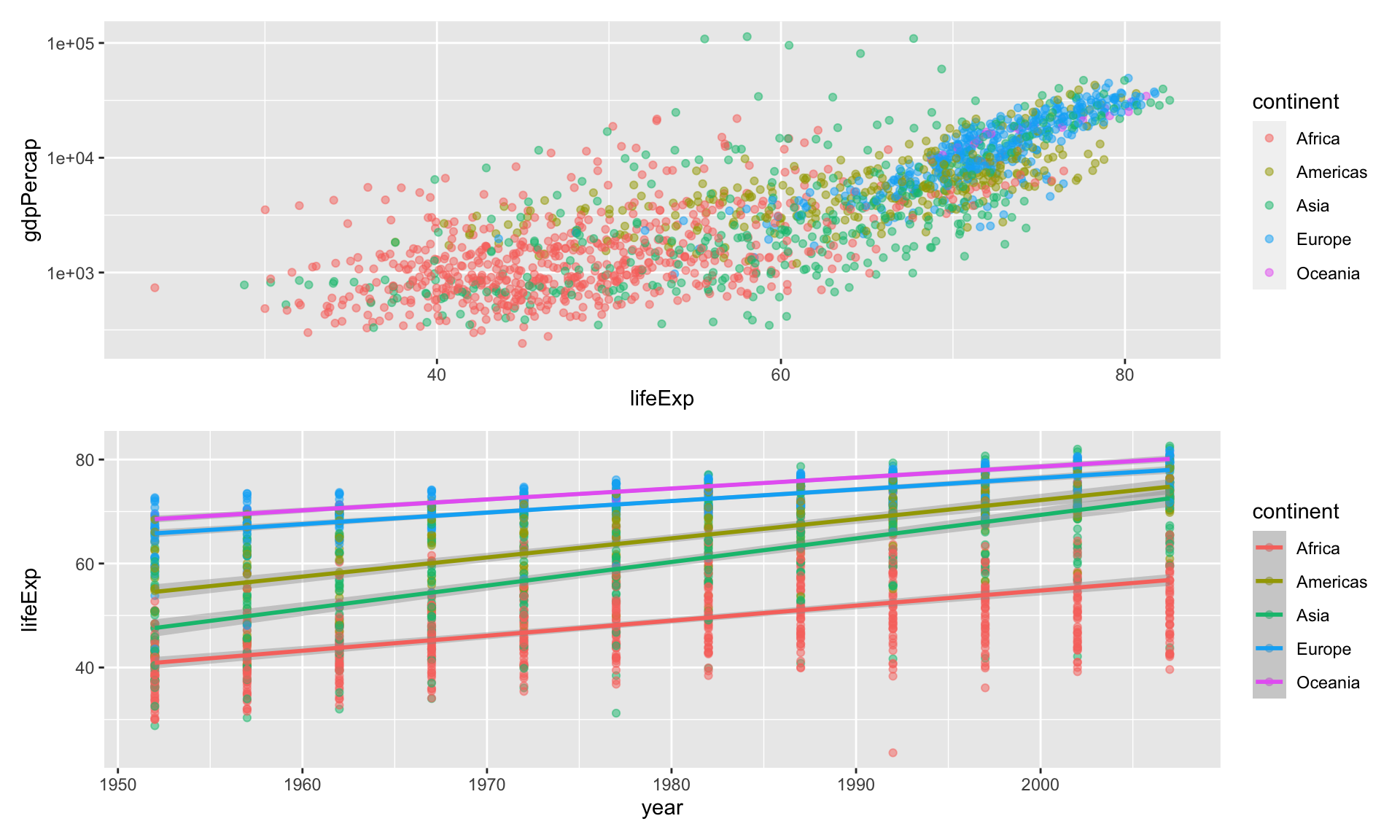 ggplot(aes(lifeExp, gdpPercap, colour = continent)) +