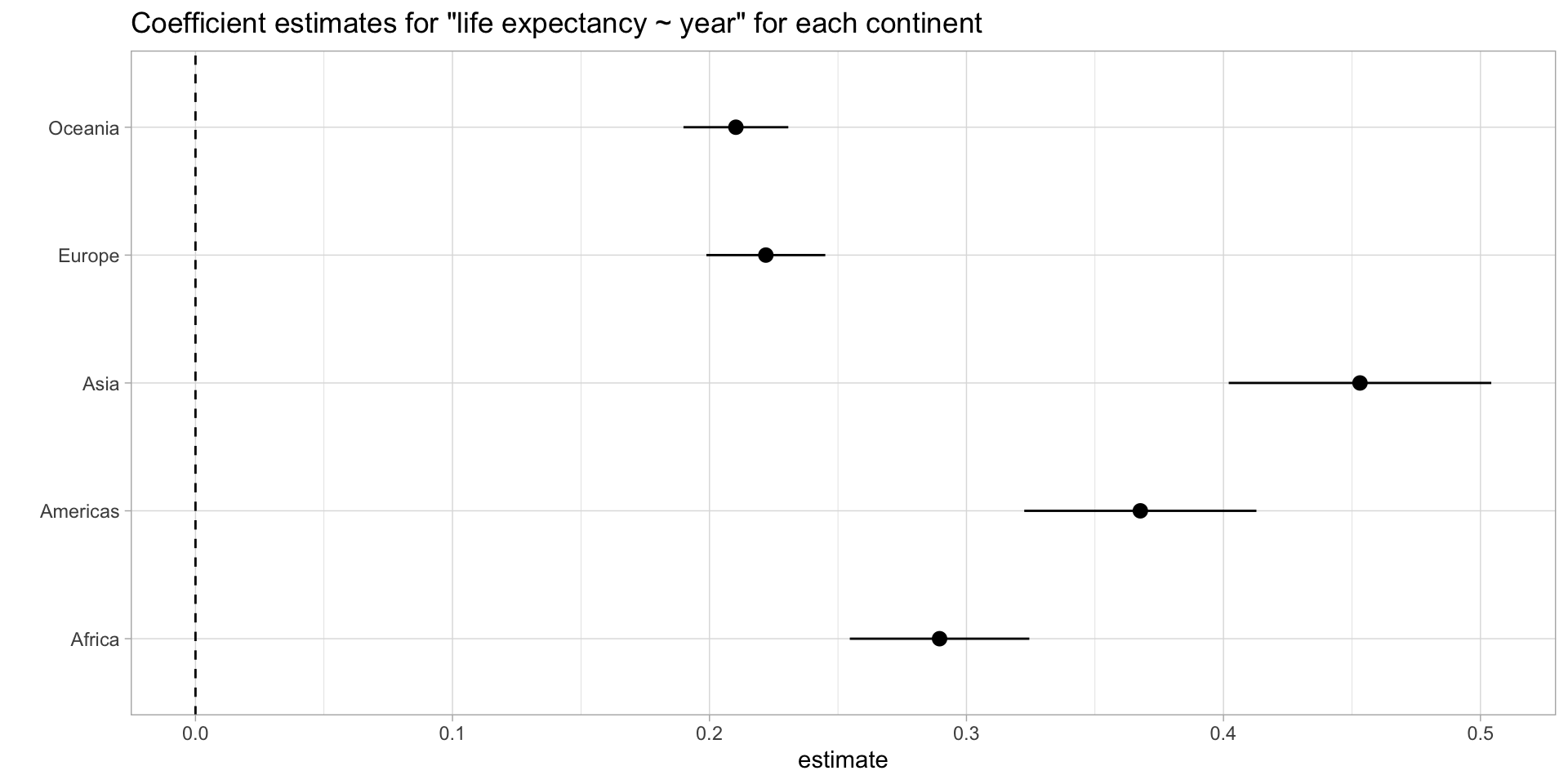 The previous idea was nice, but you still need to create a list of dataframes at the start (continent list). This is not always desired, and sometimes it would be great to keep things all in one place (data, models, coefficients).